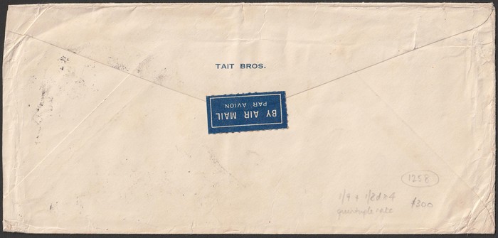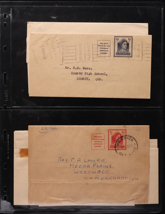 1467 imageWrappers: 1938-50s range with 1953 QEII 2½d brown (3) inc uprated for Airmail letter rate (total franking 1/6), 1959 5d blue & 1975 11c/7c uprated. Also 1938 Queen 1d PO & PTPO ($180) & QEII PTPO 3½d orange embossed ($250). Mostly G-VFU, some mixed. ACSC cat $600. (9) (Image1) (Image2) (Image3)