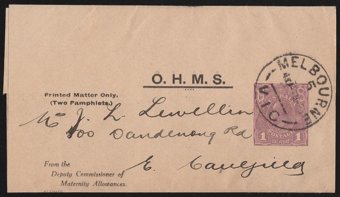 1468 imageWrapper - Official: 1922-23 OHMS KGV 1d violet solid OS die for Deputy Commissioner for Maternity Allowances. Superb U, 'Melbourne 7 MR 23' cds. ACSC WO5 cat $1200. Very rare. (P) (Image1)