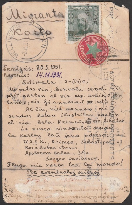 1474 image1931 Esperanto 'chain' postcard from Crimea Russia around the world & back to Crimea, sent via & franked Australia, USA, Germany, Austria & Russia, plus Cinderella of Dr Zamenhof, creator of the language. Typical flts having spent 6 months in transit. (Image1) (Image2)
