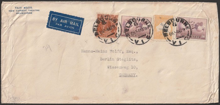 1477 image1938 airmail cover franked with CofA wmk 5/-, KGV 5d & 1/6 Hermes (2) (Aug) Melbourne to Germany correctly paying the quintuple airmail rate, minor blemishes. (Image1) (Image2)