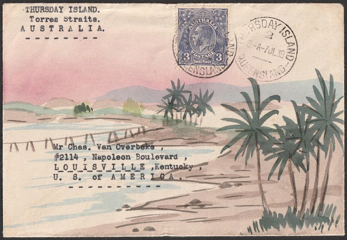 1478 image1939 'Karl Lewis' hand illustrated cover franked with KGV 3d blue tied by one of two strikes of 'THURSDAY ISLAND/QUEENSLAND Jul 7 cds to USA. Very attractive. (P) (Image1) (Image2)