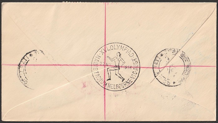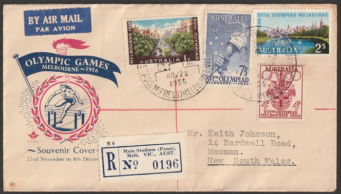 1479 image1956 Melbourne Olympics illustrated covers registered ea with set of 4 tied by pictorials cds, 'Royal' with later Main Stadium (Press) & APO Richmond Park Kiosk 1, this sent to Italy with arrival b/s. (2 covers). (Image1) (Image2) (Image3) (Image4) (Image5)