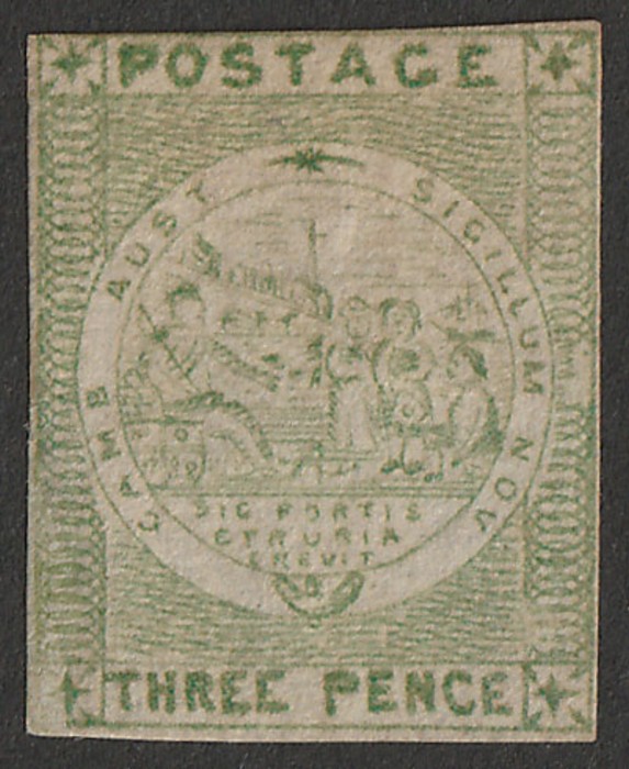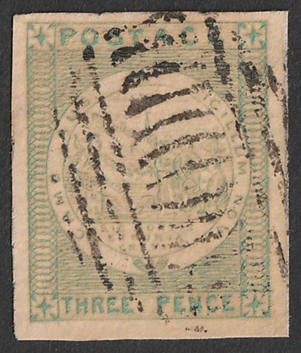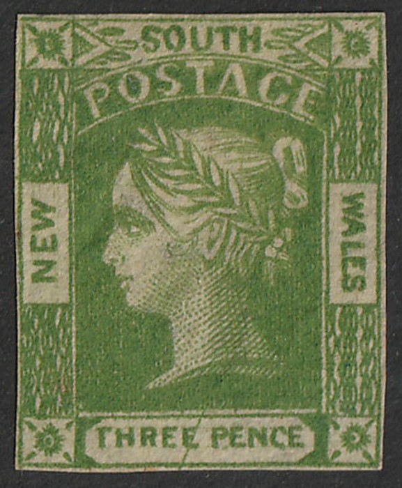 3d bright green, on yellowish laid paper. Superb U, 4 unusually large margins, barred oval Sydney pmk. Scott 96 cat US$825+. SG 43d cat £650+. Exceptional quality. 2024 Ceremuga AIEP photo cert. (P) (Image1)