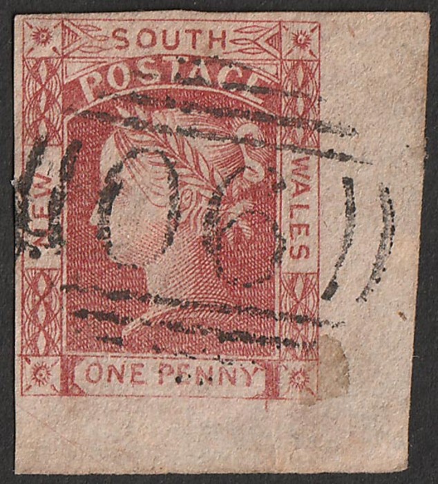 1d carmine, on thick yellowish paper, no wmk. VF appearance, small thins, LR cnr marginal with 4 margins, barred oval '90' pmk. Scott 10 cat US$360+. SG 44 cat £350+ & under-catalogued. Exceptional appearance sheet cnr example. (P) (Image1)