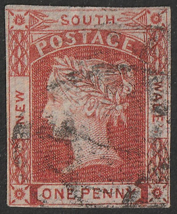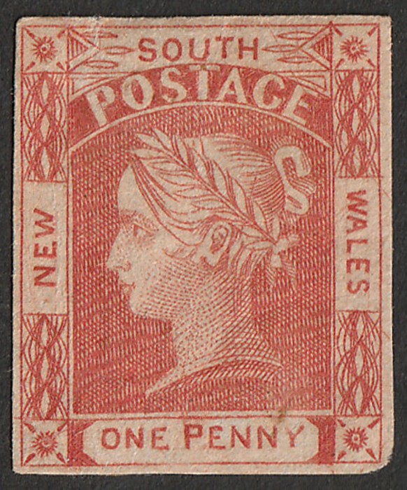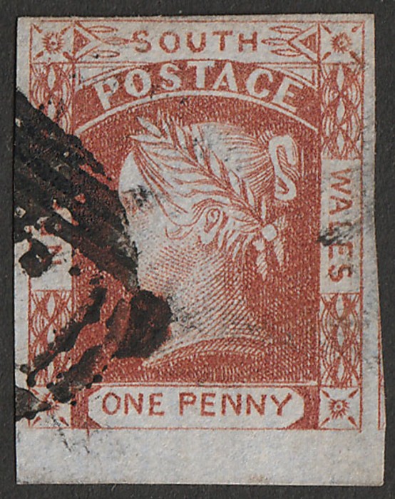 1d claret, no wmk, on thick vert laid bluish paper. Superb U, bottom marginal with 4 margins. Scott 12a cat US$525+. SG 50 cat £500+ & both such under-catalogued. 2024 Ceremuga AIEP photo cert. (P) (Image1)
