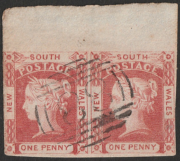 1d scarlet, top marginal se-tenant horiz pr, no wmk, on bluish medium wove paper, left stamp variety 'no leaves right of South'. F-VFU, 3-4 margins. Scott 13/13d cat US$555+. SG 46/46a cat £545+ as singles, plus premium for positional se-tenant