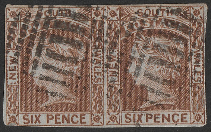 6d yellow-brown, horiz pr, on medium bluish-grey wove paper. F-VFU, 3-4 margins, barred oval pmks. Scott 18c cat US$650. SG 74 cat £600, plus premium for pr. (P)
