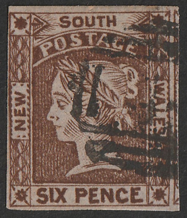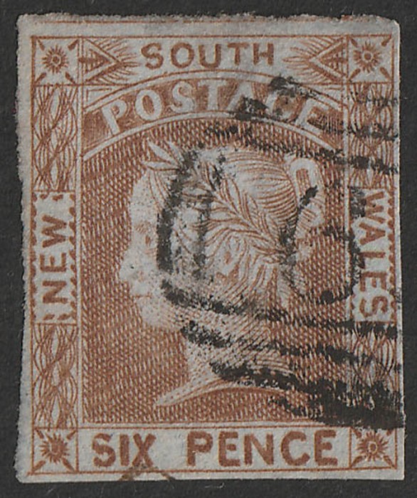 6d yellow-brown, on medium bluish-grey wove paper. VFU, 4 margins, barred oval 6- pmk. Scott 18c cat US$325. SG 74 cat £300. (P) (Image1)