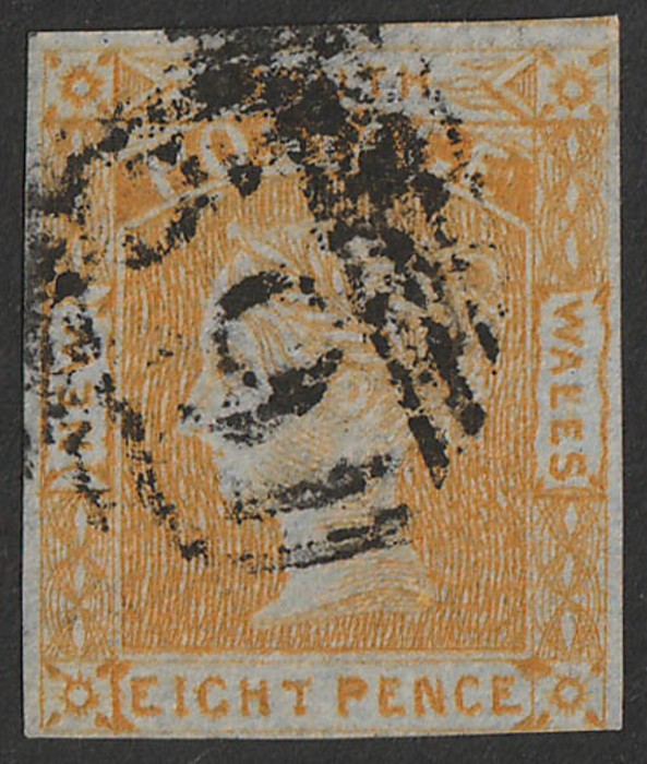 8d golden-yellow, imperf, wmk '8'. Superb U, 4 large margins, barred oval Sydney pmk. Scott 30a cat US$1575. SG 97 cat £1600. Rare genuine imperf. 2024 Ceremuga AIEP photo cert. (P) (Image1)