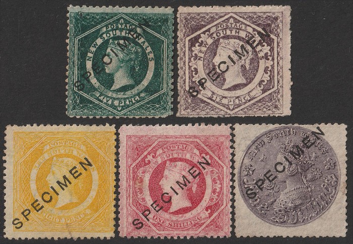 5d, 6d, 8d & 1/-, plus 1861-88 QV Coin 5/-, all opt SPECIMEN, type 2 diag (23.5x2mm). F-VF UN. SG 160, 165, 167c, 168, 174 (3) cat £1650 as normals. (5) (P)