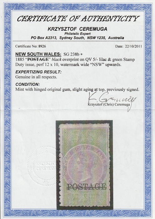 black opt QV 5/- lilac & green Stamp Duty, perf 12x10, wmk NSW upwards. F-VFM, with original gum. Sc 72 cat US$850. SG 238b cat £1000. Rare genuine mint. 2011 Ceremuga AIEP photo cert. (P) (Image1) (Image2)