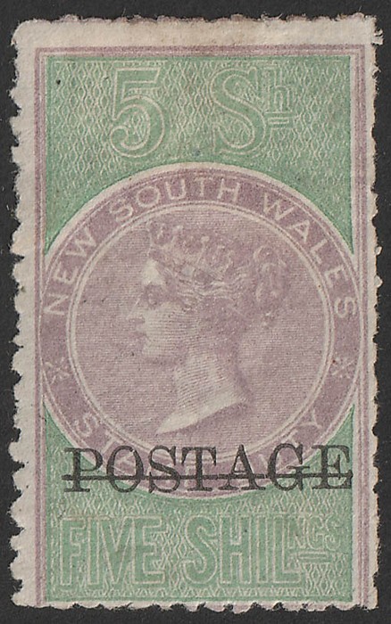 seriffed opt on QV 5/- purple & green Stamp Duty opt POSTAGE in black, perf 11, wmk NSW sideways, from 1895 Special printing for PO sets. VF CTO with gum NSW ovals pmk. SG unlisted as unissued with OS opt. Rare as only 208 sold (158 with NSW pmk).