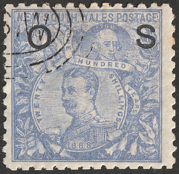 Carrington 20/- cobalt blue, perf 10, wmk '20/- NSW' in circle, from 1895 Special printing for PO sets. VFU/CTO with gum, NSW ovals pmk. Scott O33 cat US$1150. SG O50 cat £1100. Rare as only 208 sold (only 158 with NSW pmk). 2024 Ceremuga AIEP