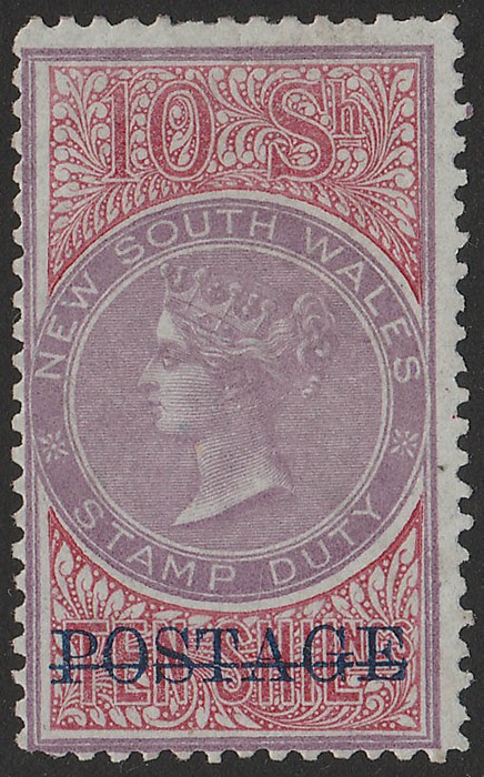 opt QV 10/- violet & claret Stamp Duty, wmk NSW sideways, perf 12x11. F-VF fresh M. Sc 76d cat US$350. SG 275b cat £400. (P) (Image1)