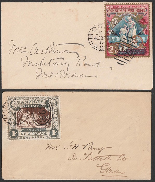 1/- & 2/6 on separate locally addressed covers tied in 1897 (July) in Oxford St & Mosman respectively, odd blemish. SG 280-81 cat £50 & £275 as loose stamps & 'from x2' on cover. (P) (Image1) (Image2)