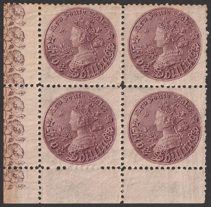 reddish-purple, LL cnr marginal blk of 4 with fancy flower pattern in margin, perf 11. VF M/MLH, some tropicalised perfs. Scott 101 cat US$240+. SG 297c cat £240, plus premium for blk. (P) (Image1)