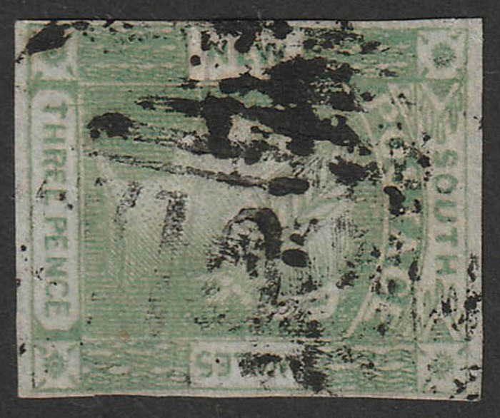 102 of Carroll type 1A (RRRRR) Sl blurred strike on 1851 QV Laureate 3d green. Illustrated in Freeman & possibly UNIQUE. (P) (Image1)