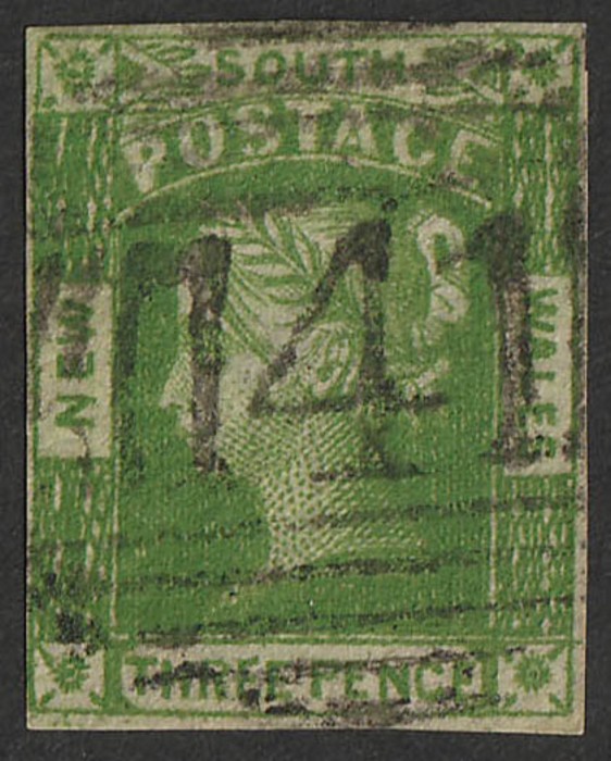 140 of Moorna type 1A (RRRR) 2 light strikes on 1854 QV 1d Laureate vert pr. Illustrated in Freeman. (P) (Image1)