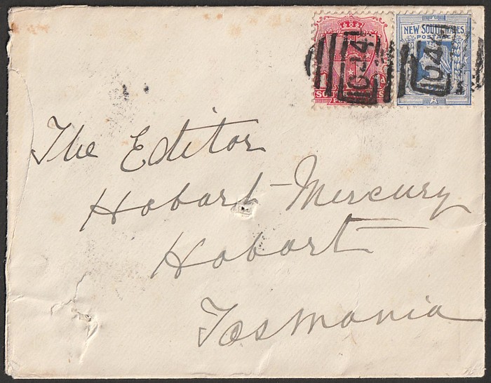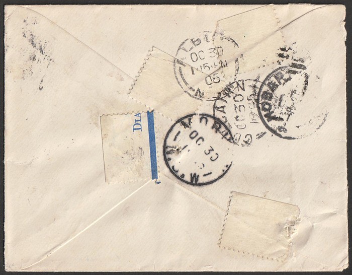 1044 of Morven (RRRR) 2 VF strikes tying 1d Shield & 2d QV to 1905 cover to Hobart. Possibly unique, illustrated in Freeman page 227. (Image1) (Image2)