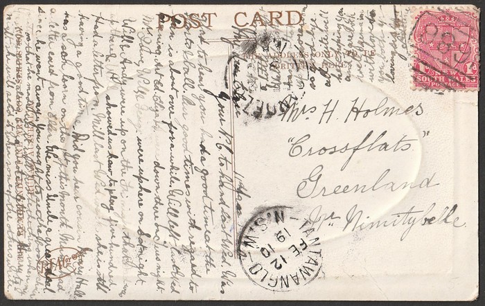 1686 of Tantowanglo (RRRR, closed 1957) on 1d Shield attached to 1910 PPC to Greenland nr Nimitybelle with Tantawanglo departure & Candelo transit cds. (P) (Image1) (Image2)