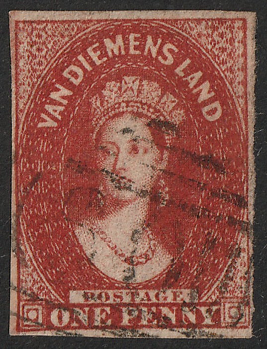 carmine, imperf, wmk Large Star. VFU, 4 margins, barred oval pmk. Scott 4 cat US$1000. SG 14 cat £900. 2024 Ceremuga AIEP photo cert. (P) (Image1)