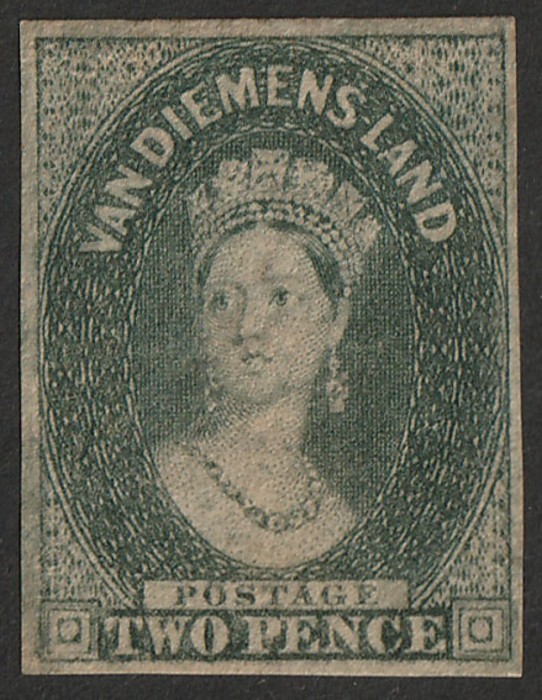 2d slate-green, imperf, wmk '12'. Superb MLH , original gum, 4 margins. Scott 12 cat US$450. SG 34 cat £500. Rare genuine Mint. 2024 Ceremuga AIEP photo cert. (P)