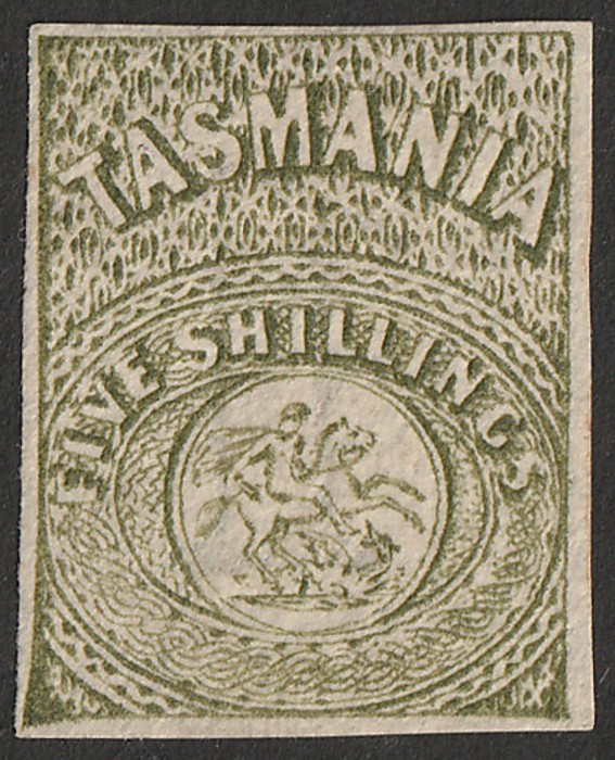 Dragon 5/- sage-green Postal Fiscal imperf. Superb fresh MLH, original gum, 4 margins. Scott AR3 cat US$1000. SG F5 cat £1100. Very rare genuine Mint as almost all offered are cleaned F/C. 2024 Ceremuga AIEP photo cert. (P) (Image1)