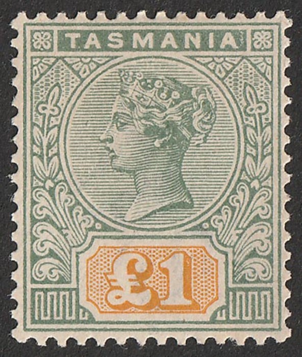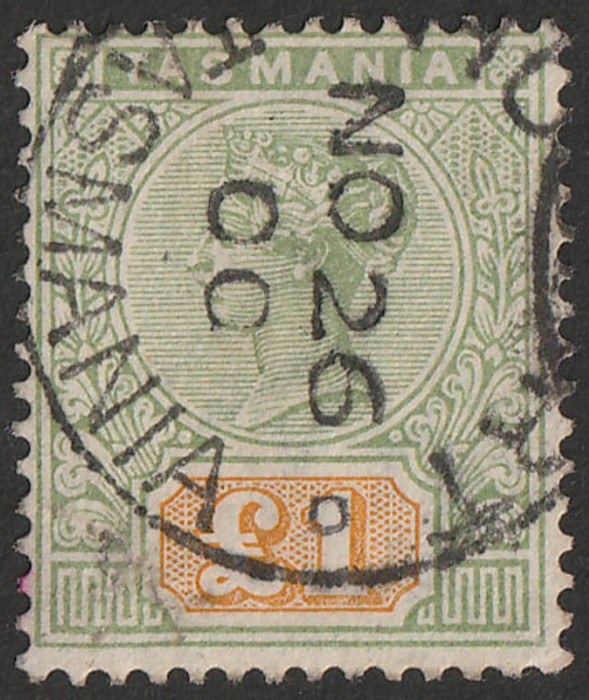 £1 green & yellow. VFU appearance, internal split in LL cnr, 'Hobart NO 26 99 Tasmania' cds. Scott 85 cat US$550. SG 225 cat £500. (P) (Image1)