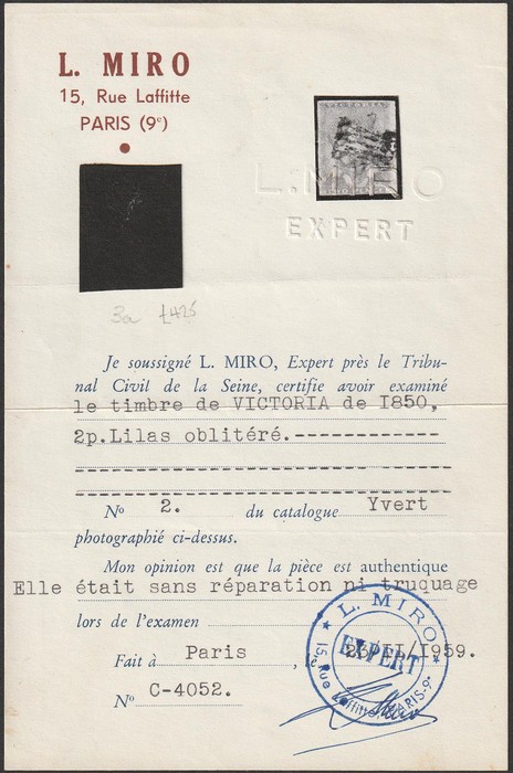 2d grey-lilac, Ham printing, original state of dies. VFU, almost 4 margins, Butterfly pmk. Scott 5 cat US$550. SG 3a cat £850. 2024 Ceremuga AIEP photo cert. (P)