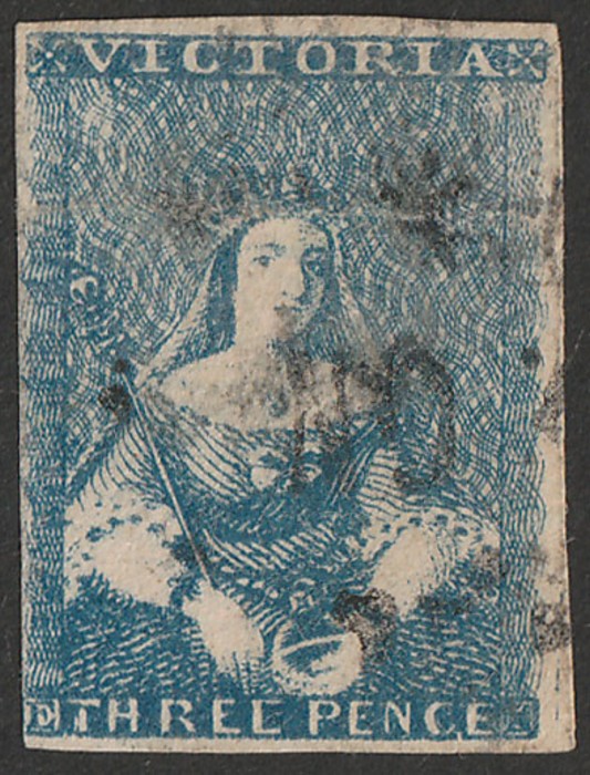 3d blue, Ham printing, original state of dies. F-VFU, 3½ margins, black Butterfly 1 pmk. Scott 3 cat US$450. SG 4a cat £550. 2024 Ceremuga AIEP photo cert. (P)