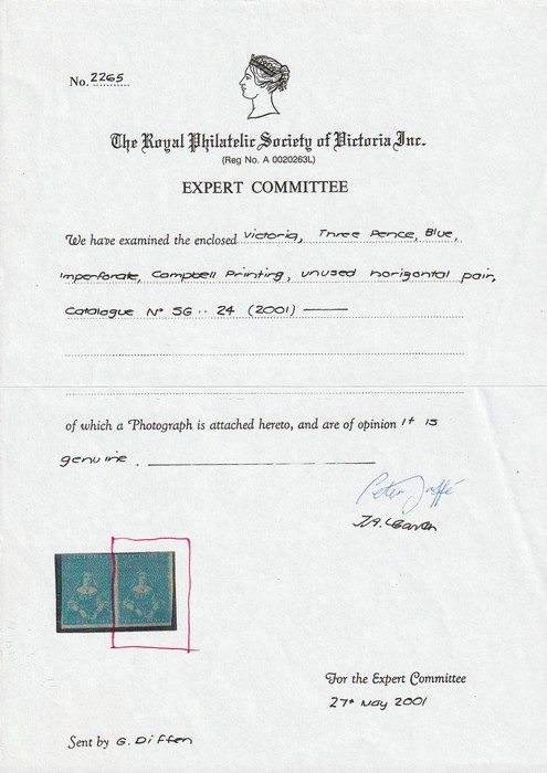 6d lilac & green, imperf. Fresh M, original gum, sl thins at top & LR cnr crease, 4 margins with nice colours & superb appearance. Scott LF1 cat US$3750. SG 33 cat £3750. Nice looking & very rare genuine Mint example. 2025 Ceremuga AIEP photo