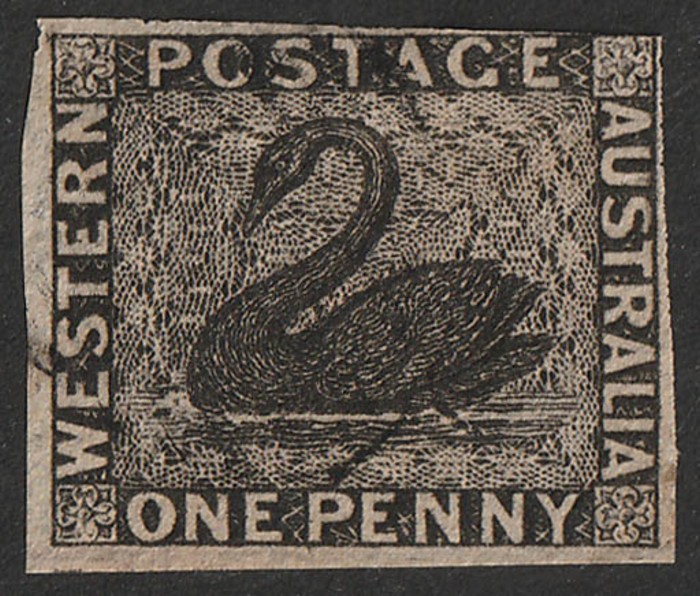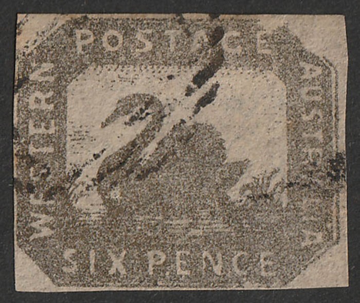 grey-black, Lithographed, imperf, wmk Swan sideways. Superb U, 4 margins, light barred oval pmk. Scott 4 cat US$700. SG19 cat £600. Premium quality. 2025 Ceremuga AIEP photo cert. (P) (Image1)