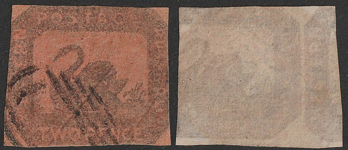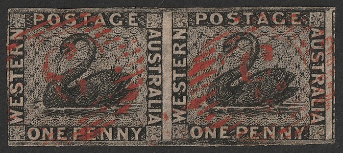 horiz pr, imperf, wmk Swan sideways. VFU, almost 4 margins, red numeral cancel. Scott 1 cat US$700+. SG 1 cat £700+, plus premium for multiple. Attractive multiple. (P)