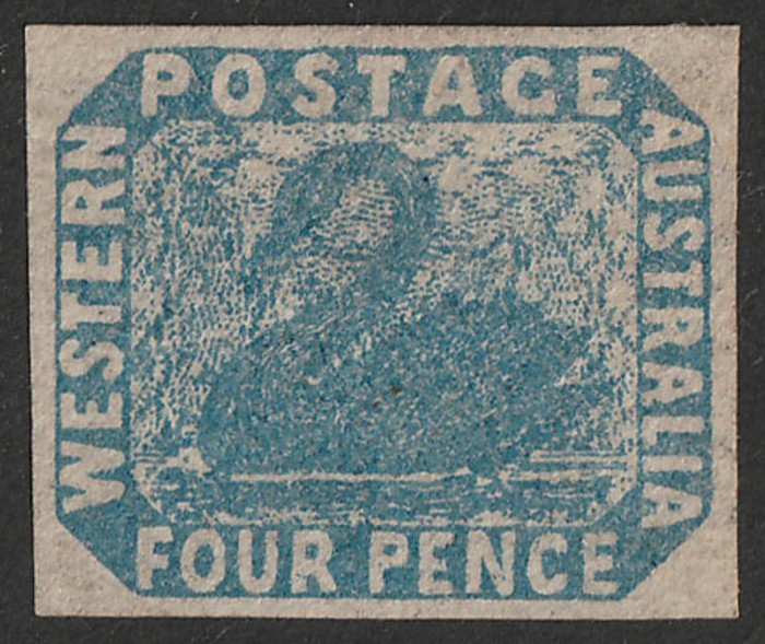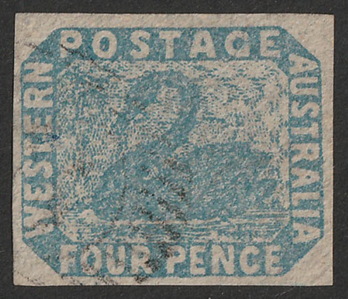 pale blue, imperf, wmk Swan sideways. Superb U, 4 large margins, barred oval pmk. Scott 3 cat US$225. SG 3 cat £200. (P) (Image1)