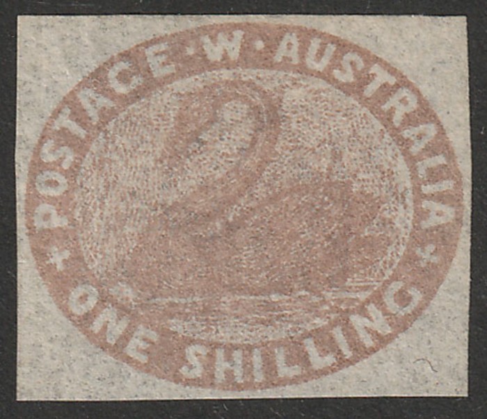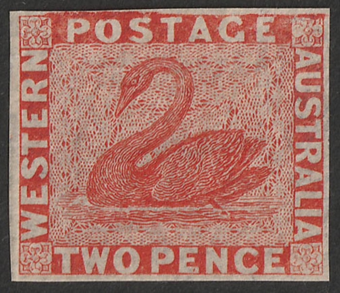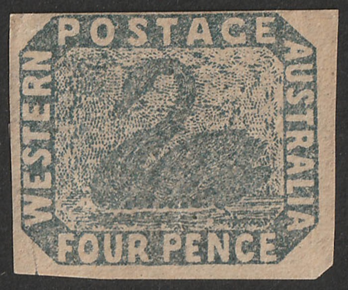sage-green, imperf, wmk Swan sideways. VFU, 4 large margins, blue barred '2' pmk. Scott 16 cat US$425. SG 28 cat £450. Unusually nice. (P) (Image1)