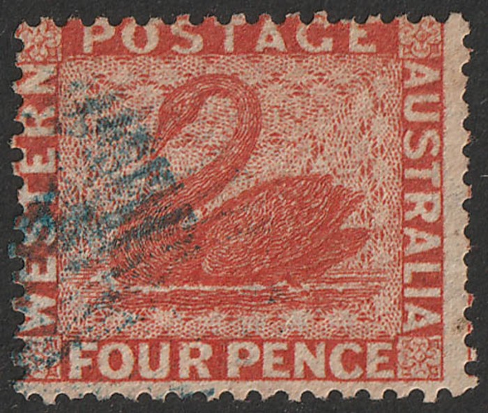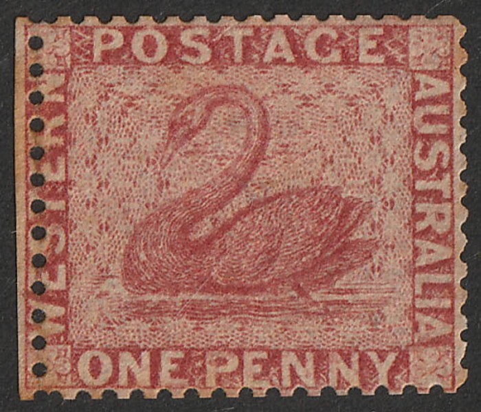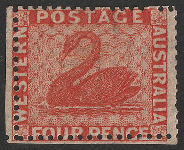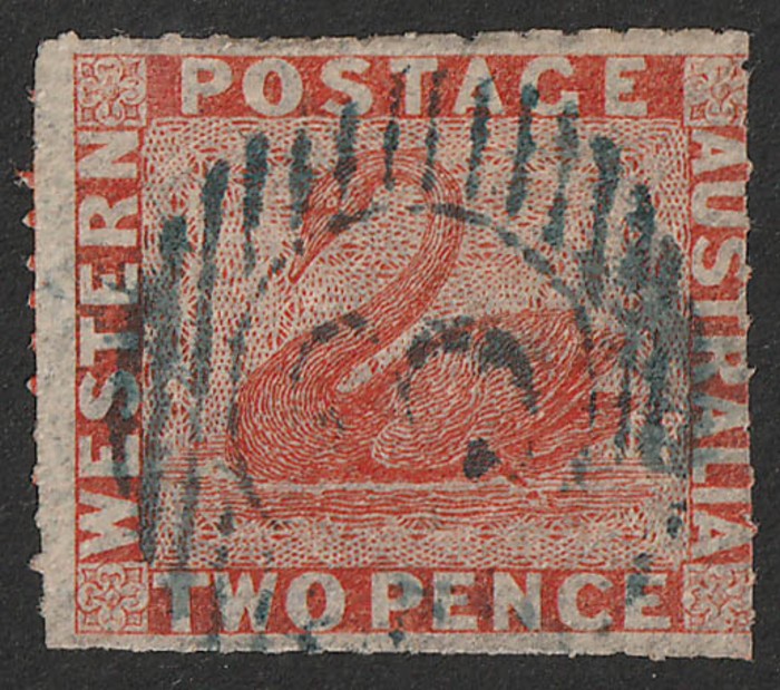 pale orange-vermilion, rouletted about 12 on all 4 sides, wmk Swan sideways. VFU, barred '3' pmk. Scott 17 cat US$275+. SG 30 cat £300+ & under-catalogued. 2025 Ceremuga AIEP photo cert. (P) (Image1)