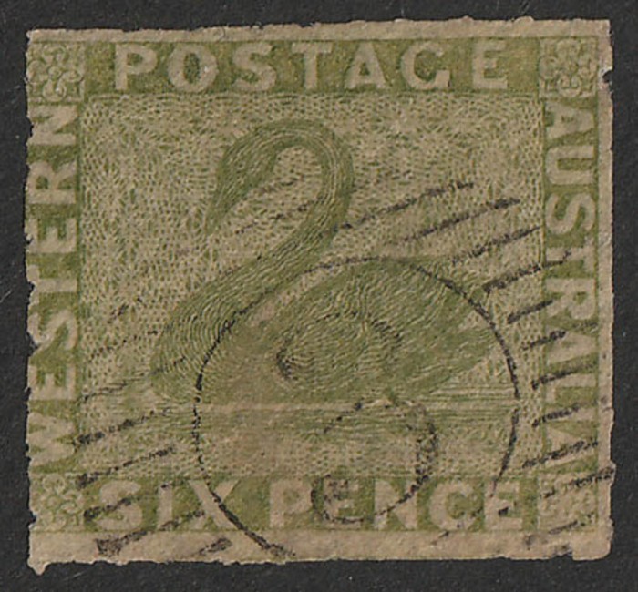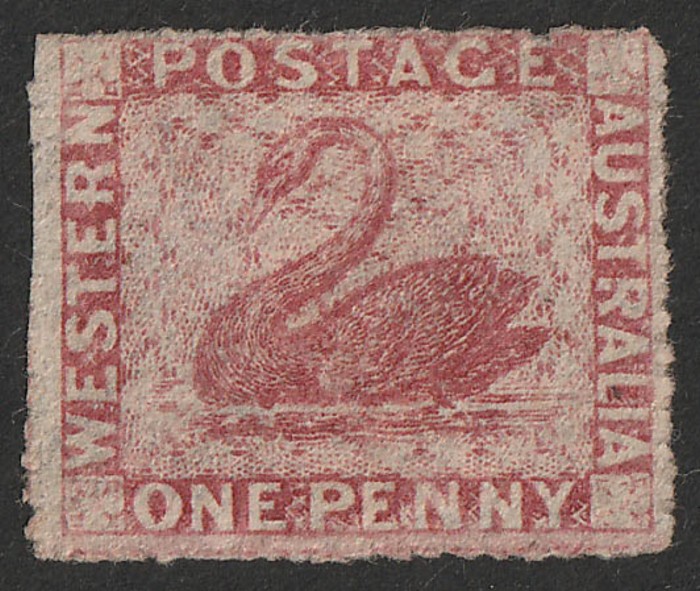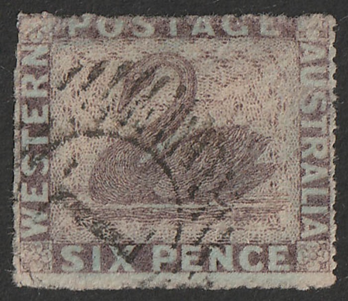purple/blued paper, wmk Swan, rough perf 14-16. F-VFU, barred numeral '1' pmk. Scott 24c cat US$525. SG 45 cat £600. 2025 Ceremuga AIEP photo cert. (P) (Image1)