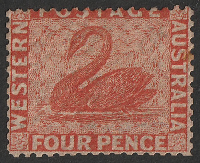 vermilion, wmk Swan, perf 14. F-VF UN. Scott 25B cat US$500. SG 40 cat £600. (P) (Image1)