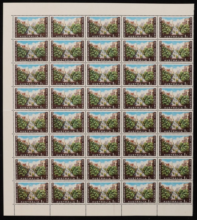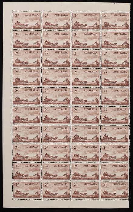 Olympics 2/- sheet of 80 with sheet number at LR cnr & ACSC listed varieties 'White spot on top of building' (pos 2/2) & 'Flaw on T of AUSTRALIA' (2/4). F-VF fresh MNH. ACSC 335 d e z za zb cat $330. (80) (Image1)