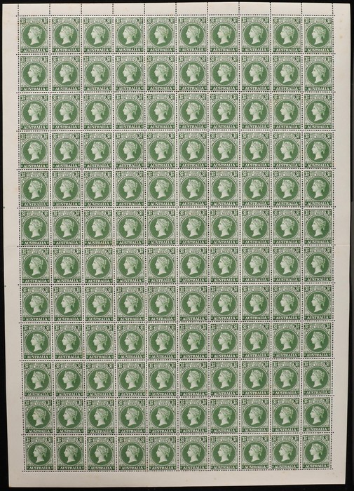 Australian Centenary 3½d sheet of 120 with perf-pips at left. Approx 20 stamps with mostly light toning, mostly in the upper & lower sheet positions. ACSC 330 b cat $140. (120) (Image1)