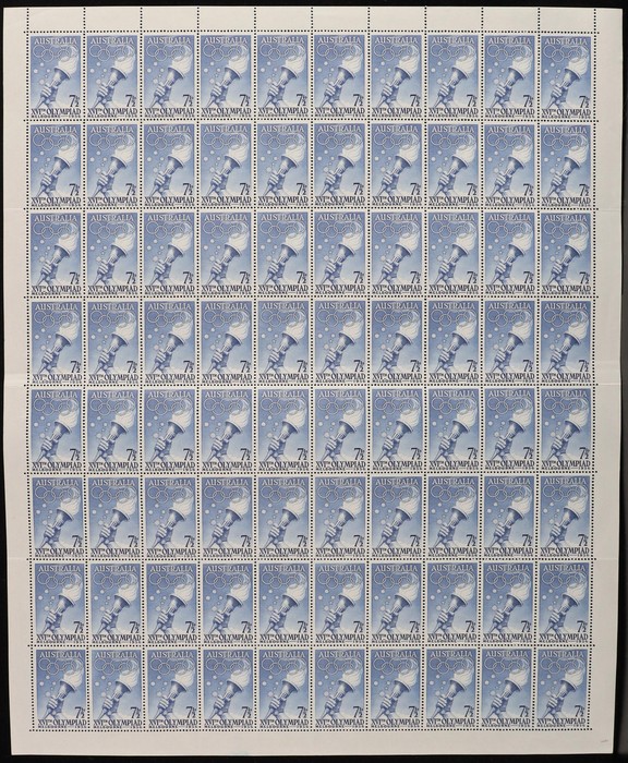 Olympics 7½d sheet of 80 with ACSC listed varieties 'Weak entry right of 2 of traction' (pos 7/1, 8/1). VF MNH. ACSC 333 g cat $160. (50) (Image1)