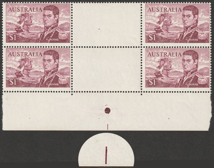 Flinders plate number 1 lower marginal gutter blk of 4. VF fresh MNH. SG 401(var). ACSC 463 z cat $400. Rare. (P) (Image1)