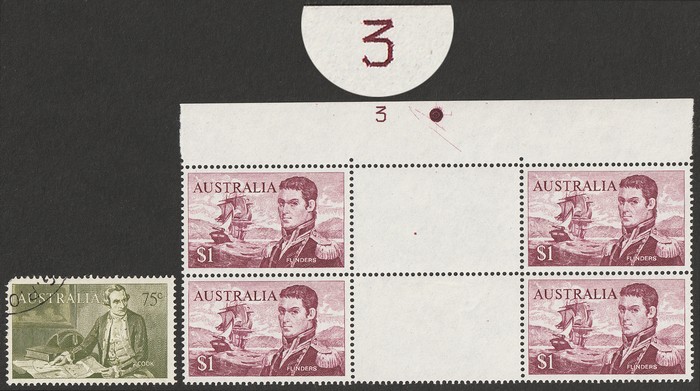 Flinders perf 15x14, Plate number 3 upper marginal gutter blk of 4. Fresh MNH. SG 400c cat £340 as single stamps. ACSC 464 z cat $500 & under-rated. (P) (Image1)