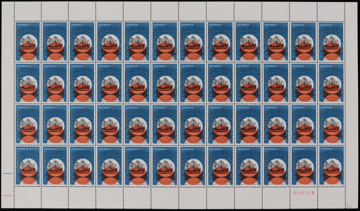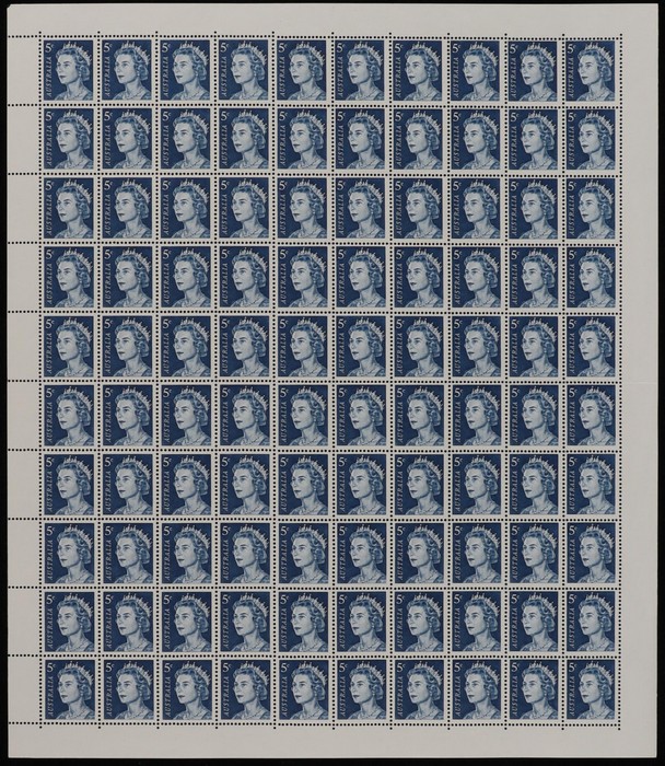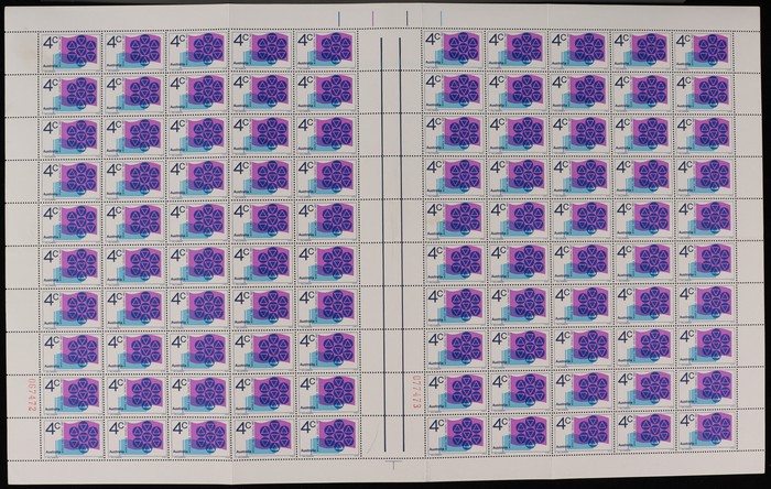 sheet of 48 with blue, black Autotrons at UR cnr, red sheet number at LL & varieties 'retouch under TR of AUSTRALIA' (pos 7/2) & 'retouch over AL of Royal' (pos 10/1). Fresh MNH. ACSC 470 d e z zc cat $60. (48) (Image1)