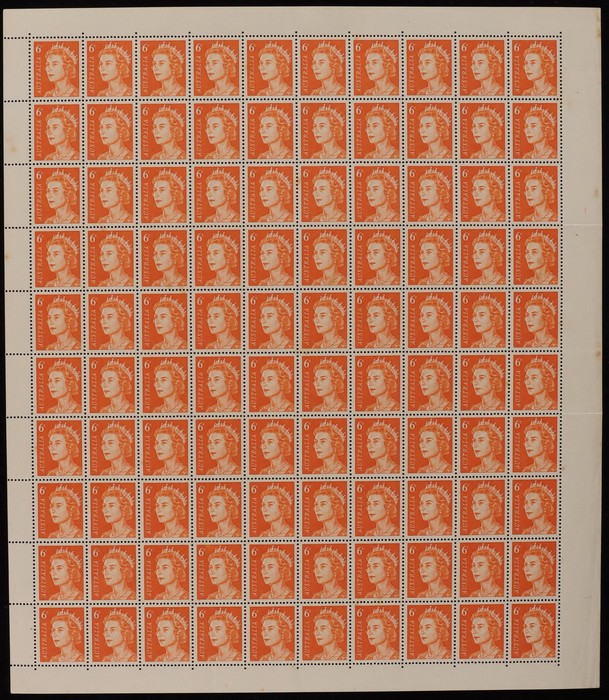 sheet of 100, plated as Sheet F with ACSC listed variety 'weak shading right of 6c' (Pos 9/4). Scattered rev tropical spots, F-VF MNH. ACSC 446 k cat $70. (Image1)
