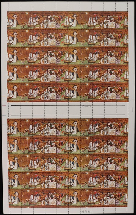 right pane of 50 inc part gutter strip at left inc gold & green Autotrons at UL cnr, black sheet number at LL & variety 'retouch between heads at LL' (pos RP10/1). Fresh MNH. ACSC 547 d zb cat $86. (50) (Image1)