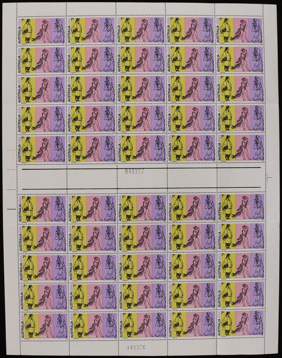 7c sheet of 50 with Autotrons at left, both black serial numbers & ACSC variety 'retouch in pink left of central dancer' (pos LP5/5). Some minor bends. F-VF MNH. ACSC 552 d z za zb cat $70. (Image1)
