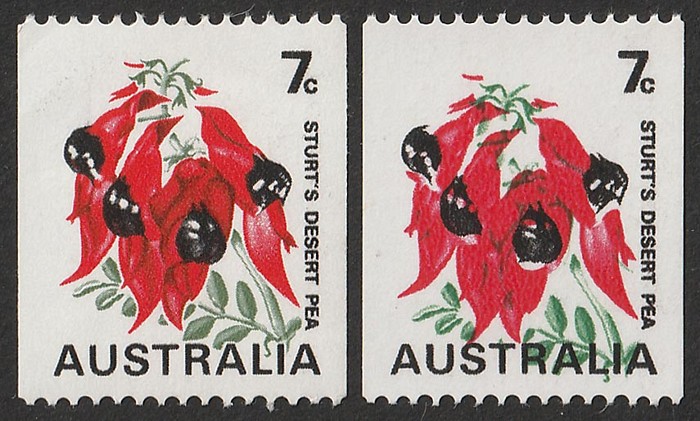 Sturt's Desert Pea error 'buff omitted & green misplaced' VF fresh MNH with normal for comparison. SG 468bb cat £225. ACSC 535Bce cat $300. (Image1)