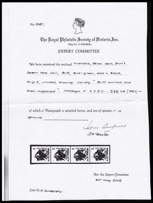 Sturt's Desert Pea error 'buff omitted & green misplaced. Vert strip of 4. VF fresh MNH, plus normal strip to compare. SG 468bb cat £900. ACSC 535Bce cat $300ea, $1200.