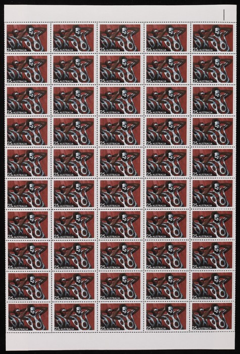 25c Body-Painting cream paper pane of 50 with sheet number at left & ACSC listed varieties '1st A of Australia weak' (pos UP 5/3). Fresh MNH. ACSC 564 d za cat $65.
